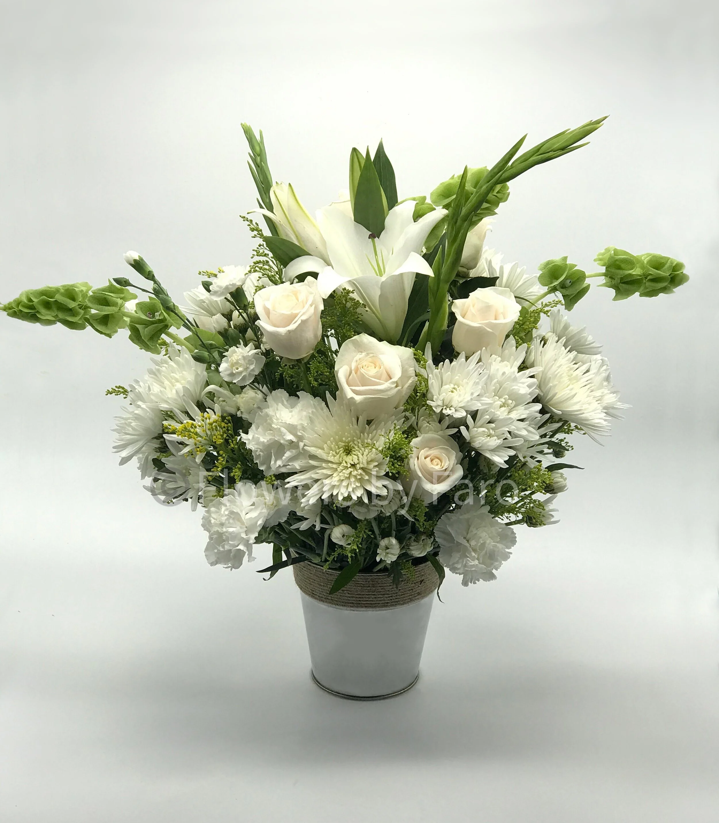 Send your most sincere condolences and offer comfort and beauty in times of sorrow with our elegant all-white Heavenly sympathy arrangement.